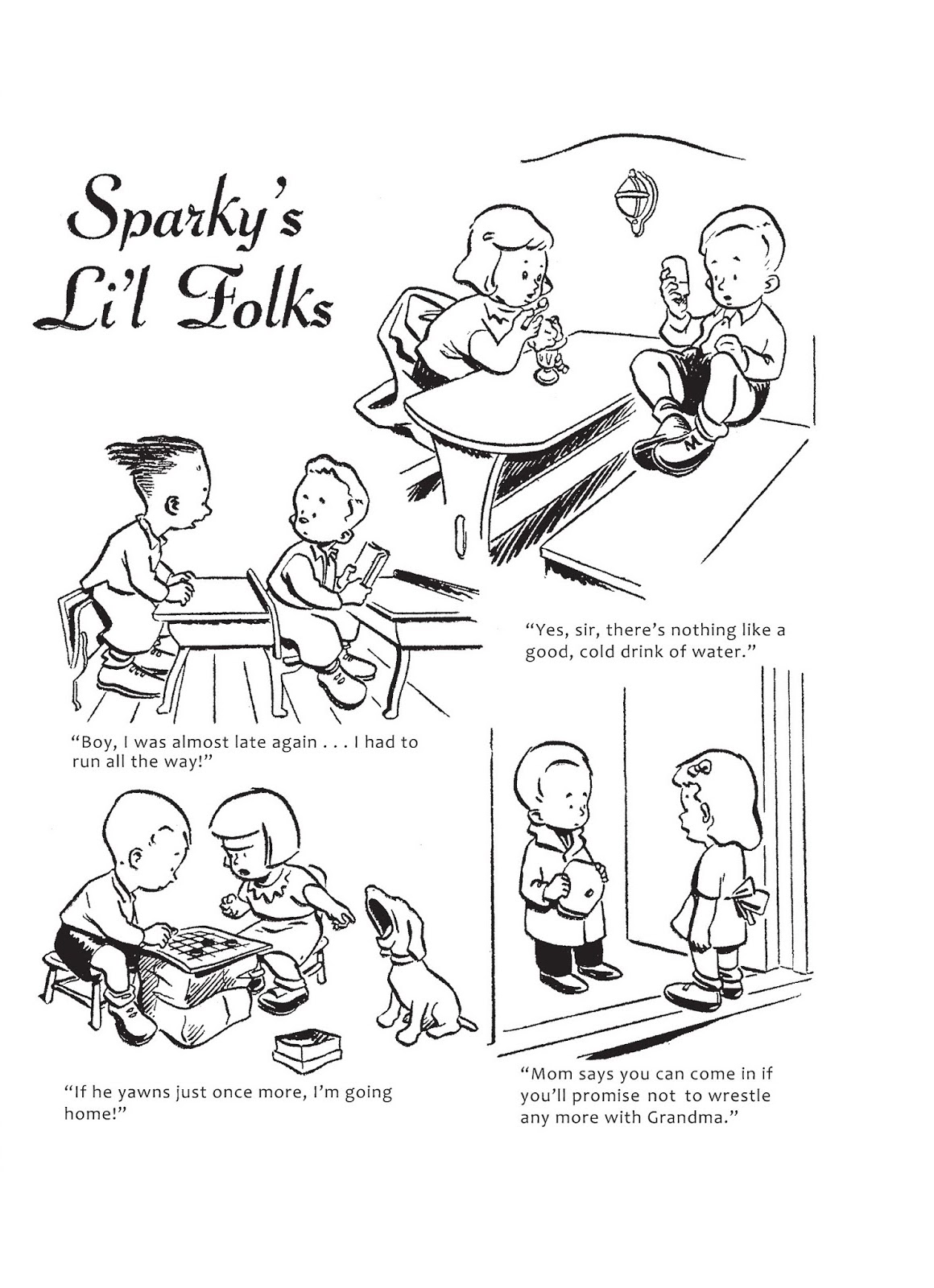 Schulz's Youth is a compilation of the strips published in 2007 by Nat Gertler's About Comics. Most of the book is devoted to cartoons about teenagers, the majority of which were serialized as Young Pillars in the Church of God magazine Youth from 1956 to 1965, with some appearing in Reach in 1969. The book also includes cartoons about young children from the book Two-by-Fours published in 1965. About also published the smaller compilations God's Children and The Zipper on My Bible Is Stuck with some color accents in 2012.