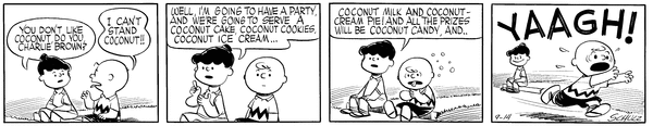 Charles M. Schulz first tried coconut as a child, and was so disgusted by it he vowed never to eat it again. Schulz's dislike carried over to both his children and the Peanuts universe, with various characters expressing their dislike of coconut since the strip's inception, to the point that it has become a running gag over the years.[1]