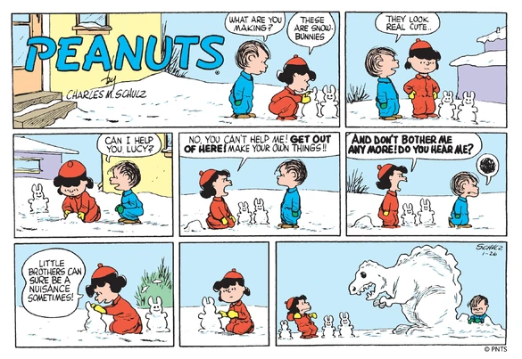 - January 26, 1958 (This strip is adapted in the segment "Snowballs" from The Charlie Brown and Snoopy Show episode "Linus and Lucy" and in the episode "Winter Wonderland" from the 2014 French TV series Peanuts)