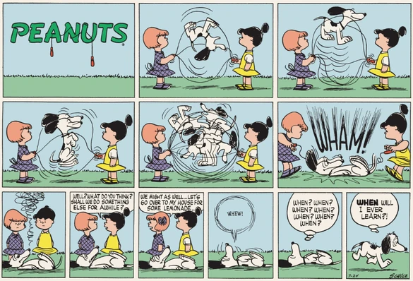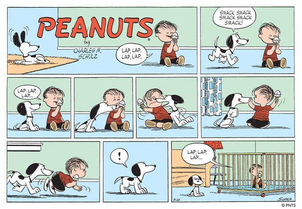 July 10, 1955 (Linus has reverted back to crawling in this Sunday strip, because Sunday strips are delayed two months unless the cartoonist prepares ahead of time)
