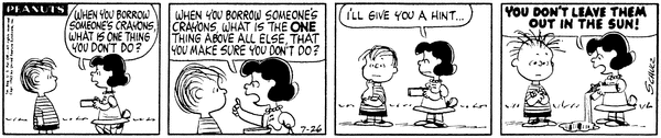 - July 9, 1963 (This strip is used on the page for March 29 of the Dayspring Peanuts A Year's Worth of Smiles and Blessings Desk Calendar)