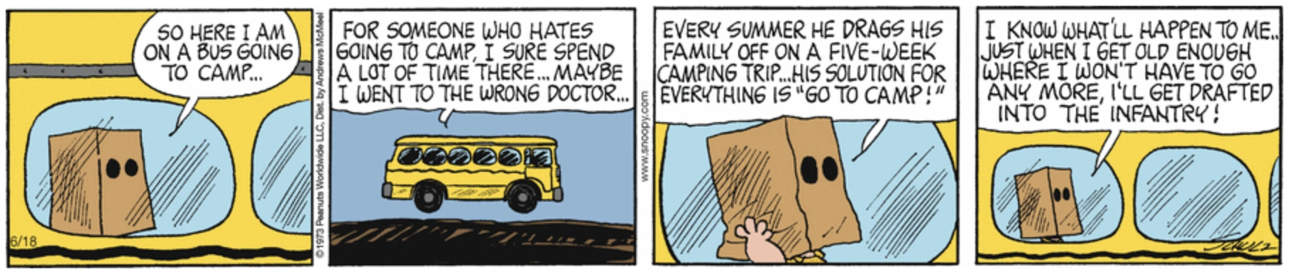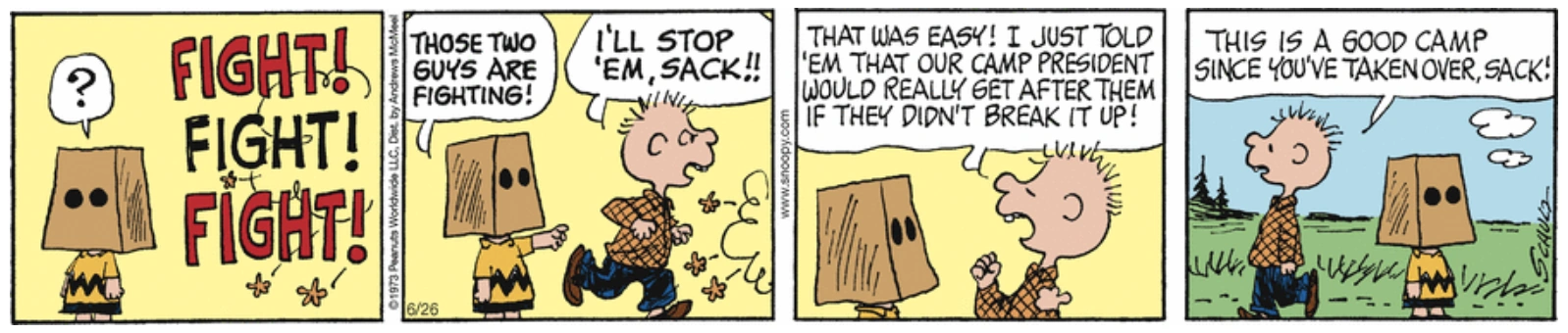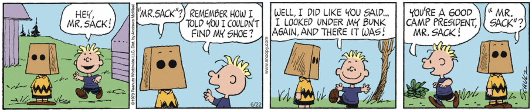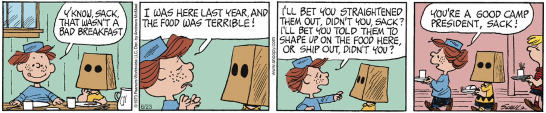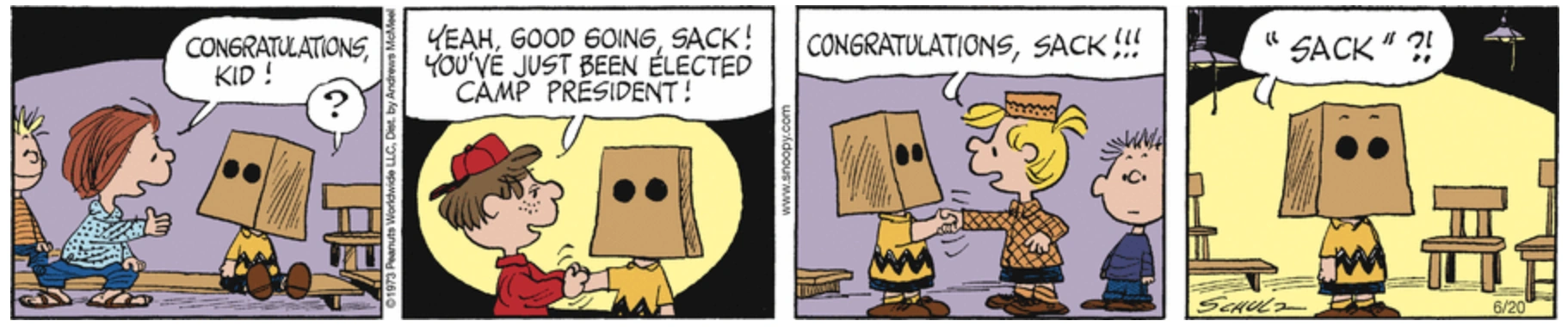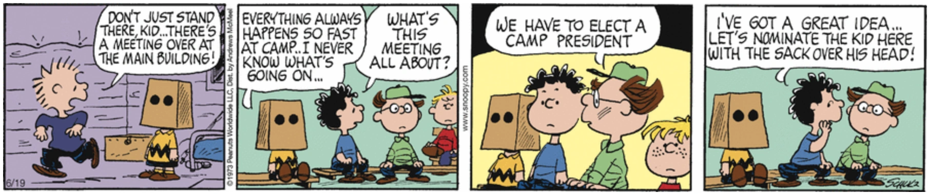 June 23, 1973 (Charlie Brown (with a paper sack over his head) is elected Camp President.)