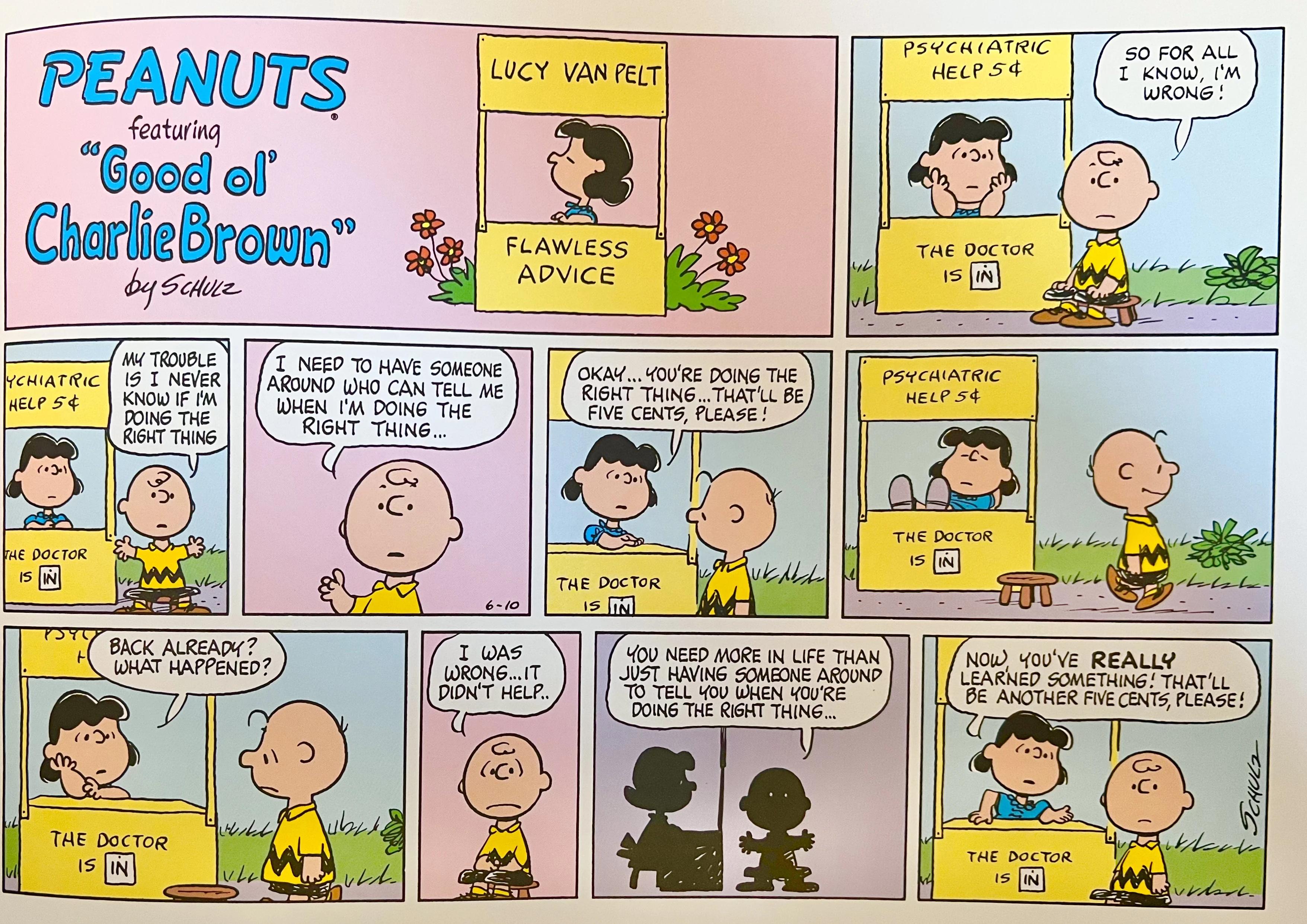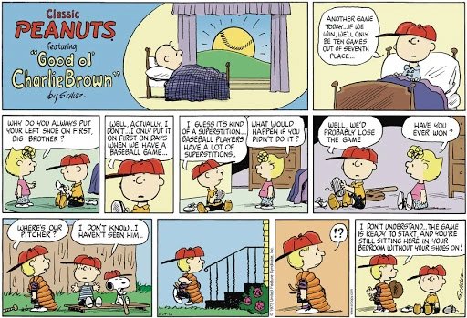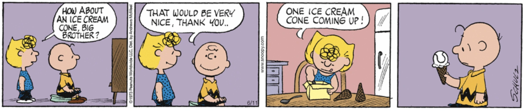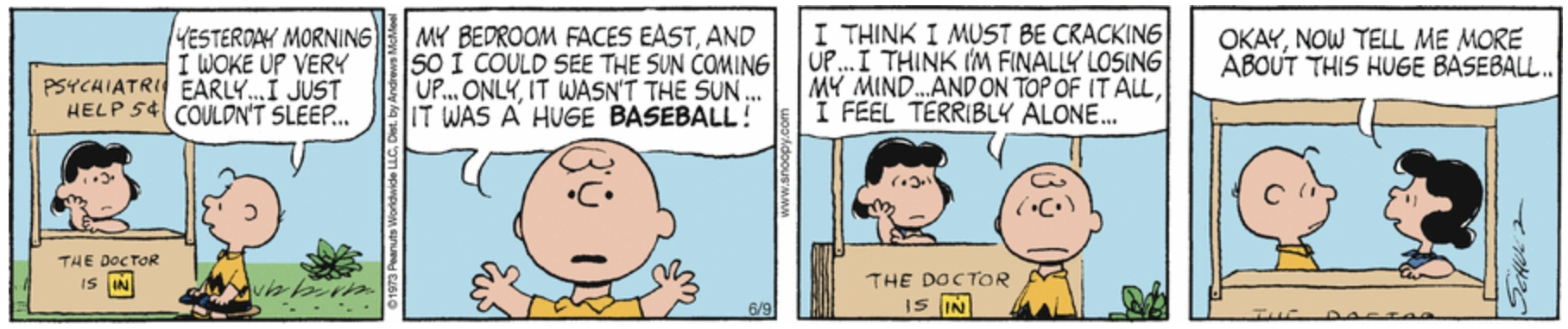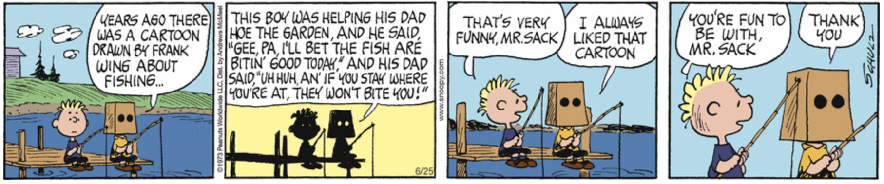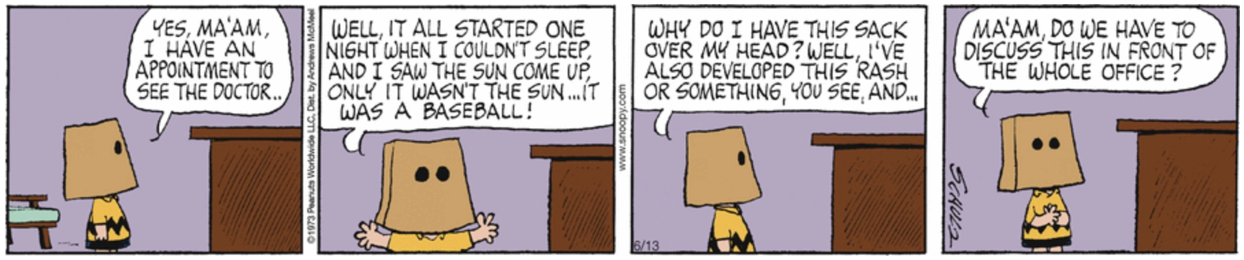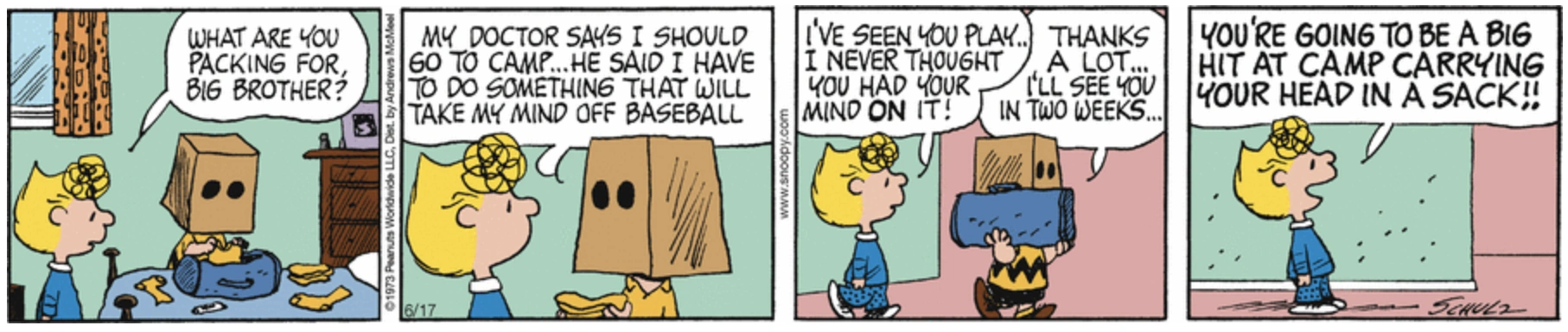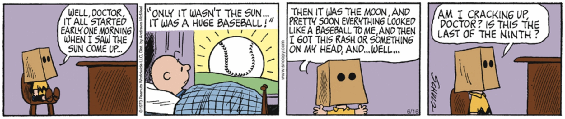 June 11, 1973 (Start of a storyline which was later adapted as the segment "Sack" in the 1983 TV special It's an Adventure, Charlie Brown) (Later appeared on the sides of the box containing a bobblehead of Charlie Brown in a Detroit Tigers uniform that was given out for free at the June 20, 2010 Arizona Diamondbacks-Detroit Tigers game in Detroit as part of the Peanuts 60th anniversary celebration. Schulz once admitted that this was his favorite story of the whole Peanuts series)