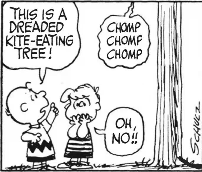 The Kite-Eating Tree is a non-human character in the Peanuts comic strip by Charles M. Schulz. As the name suggests, it is a large tree that eats kites. Charlie Brown began getting his kite caught in trees in the strip from April 12, 1956 but the Kite-Eating Tree was not named until March 14, 1965. It is often depicted with large teeth and grins when Charlie Brown approaches with a kite.