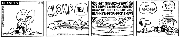 Snoopy also does the same thing to Charlie Brown when he holds it in the May 19, 1966 strip, with Charlie Brown saying he has confused him for Linus. In a storyline from November 1971, Linus asks Snoopy to take his blanket and not to give it back no matter how much he begs for it. Snoopy loves watching Linus beg. The beagle then makes the blanket into two sport coats (one for him and one for Woodstock). The next day, Linus realizes he is cured but then Charlie Brown feels bad about what happened, and buys Linus a new blanket. Linus screams and says "Now I'm hooked again!" to which Charlie Brown just replies, "I thought I was doing the right thing."