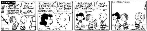 Lucy makes a kite out of Linus' blanket in the strip of June 12, 1962, but then accidentally lets go of it. It is eventually saved by the Coast Guard while floating over the Pacific Ocean and is returned to Linus.