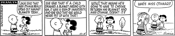 Even though Linus really likes Miss Othmar, he does not like her attitude towards his blanket. In the strip of October 15, 1959, following the storyline in which Linus falls in love with Miss Othmar, he finds out that she does not like his blanket. Charlie Brown says to Lucy "This means Linus is going to have to choose between his blanket and Miss Othmar, doesn't it?" Just then Linus walks by holding his blanket and says, "Who's Miss Othmar?" so it is clear which one he chooses. However, Linus' crush on his teacher continues.