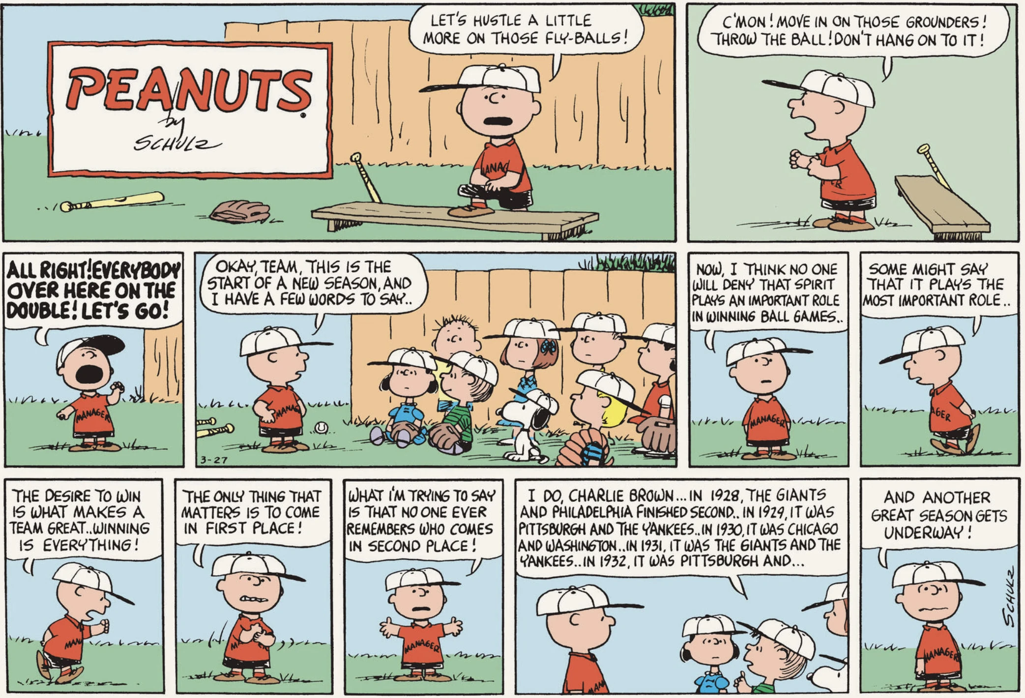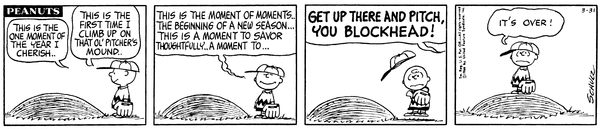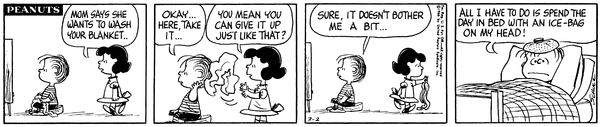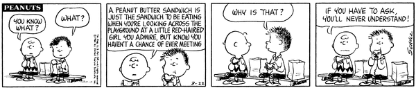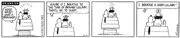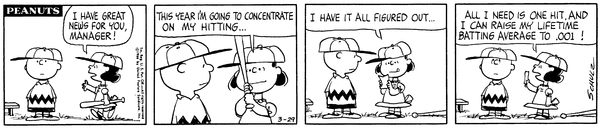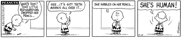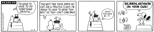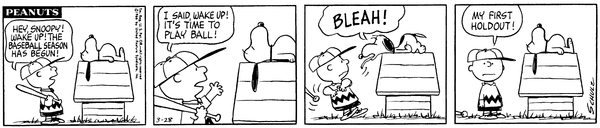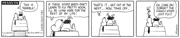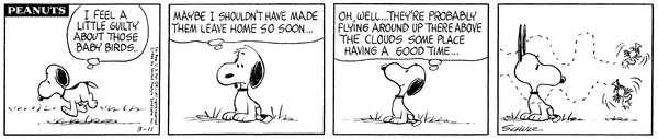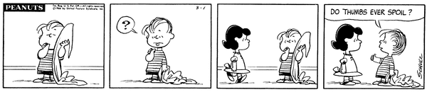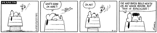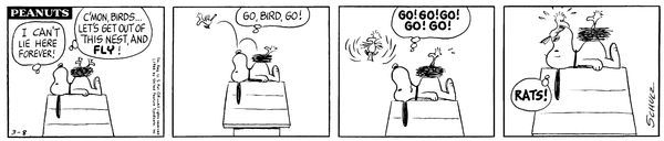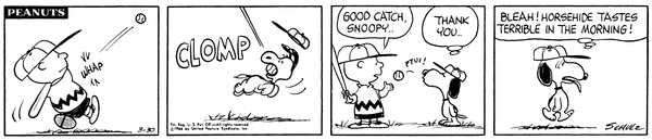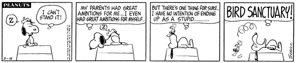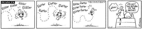 March 9, 1966 (Possibly the only strip in which Woodstock talks, although the character does say intelligible things on January 1, 1981)
