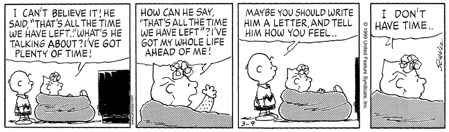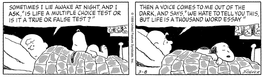 March 8, 1999 (This strip is used on the page for July 22 of the Dayspring Peanuts: A Year's Worth of Smiles and Blessings Desk Calendar )