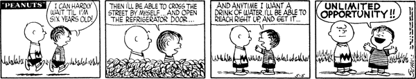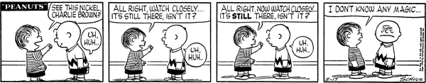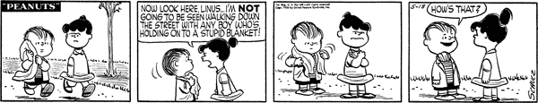 - May 17, 1956 (This strip is adapted in Good Grief, Charlie Brown: Peanuts, with Lucy replacing Linus)