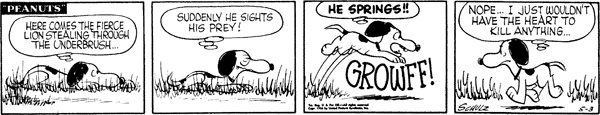 - May 3, 1956 (Snoopy's lion ego in this strip is adapted in A Boy Named Charlie Brown)