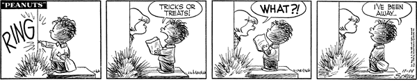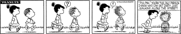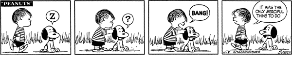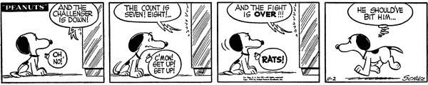 November 17, 1955 (This is effectively the first time Snoopy walks on two legs, by adapting his "dance step", which he repeats on November 23, below, and would take up once more on September 28, 1956 before Charlie Brown "teaches" him to walk on June 28, 1957)
