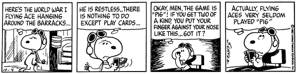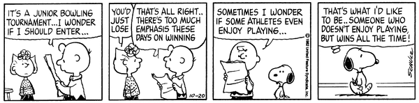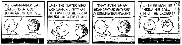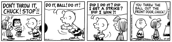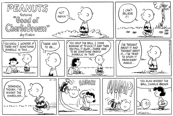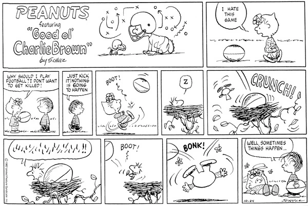 - October 24, 1982 (This strip is adapted in the segment "Football" from The Charlie Brown and Snoopy Show episode "You Can't Win, Charlie Brown")