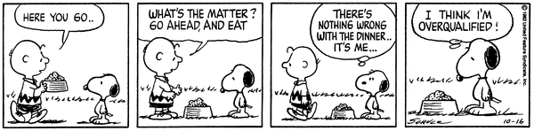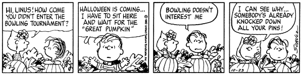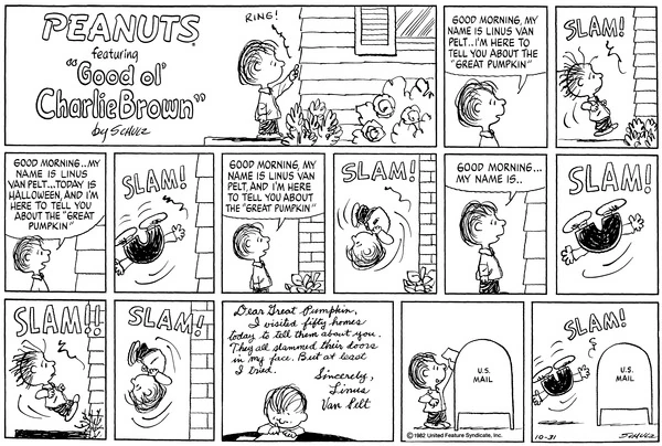 - October 19, 1982 (Beginning of a storyline which was later adapted as the segment "Great Pumpkin" from the 1985 The Charlie Brown and Snoopy Show episode "Snoopy's Brother Spike")
