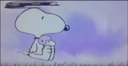 (20) It is raining. Snoopy is walking, with Woodstock sitting at Snoopy's head, and Woodstock is holding an umbrella. The rain stops. Woodstock closes the umbrella and then he hangs the umbrella on Snoopy's nose. (1987-04-13) (Blue) (A Day with Snoopy #4)