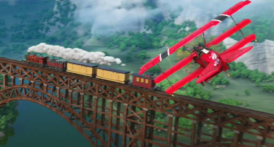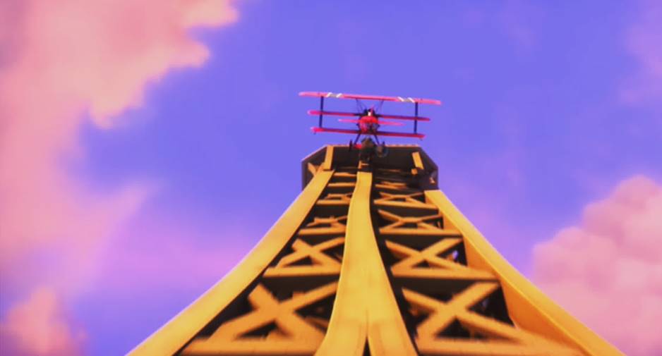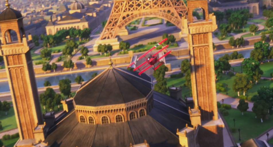 With Snoopy at his 6 o'clock position, the Red Baron performs a turn-around maneuver (hammerhead turn) at the top of the Eiffel Tower. An early trailer snapshot of this scene showed the Fokker with correct German national insignia (black crosses), which were later replaced for unknown reasons by fake national insignia (inclined black beams).