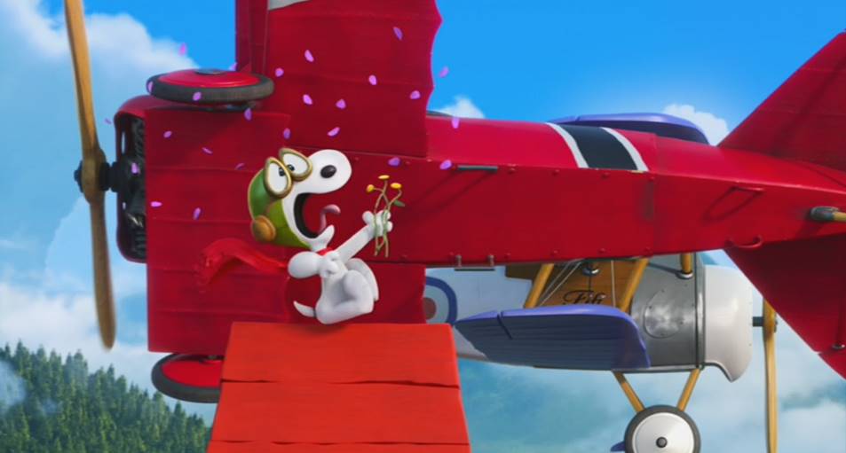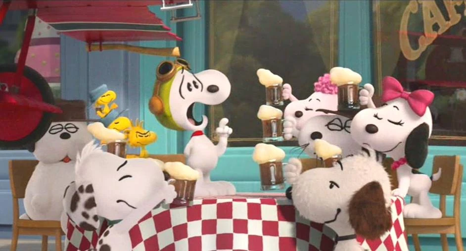 "Buzz job": Pretty scary to Snoopy, the Red Baron performs with his Fokker a very low pass to the Flying Ace's victory root beer party, leaving root beer foam all over Snoopy's face (post-credits scene).
