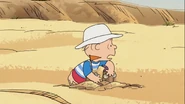 Snoopy and some of his bird friends indulge in a French Foreign Legion fantasy in Rerun van Pelt's sandbox.