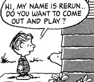 Infant Rerun appeared in several strips in November 1992, again riding on the back of his mother's bike, and unsuccessfully being taught by Lucy to count fingers. Starting in 1993, he started appearing more frequently, having grown beyond infancy, and as Schulz said, Rerun "took over" the comic by the mid-1990s[2]. Initially, toddler Rerun was shown playing cards with an equally confused Snoopy and learning to tie his shoes from Lucy.