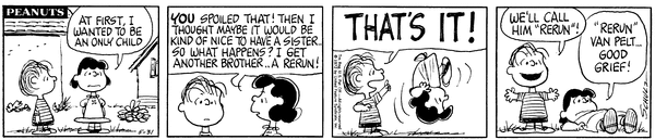 Rerun van Pelt is a supporting male character in the Peanuts comic strip by Charles M. Schulz. He is the younger brother of Linus and Lucy. Rerun is the youngest permanent character in Peanuts. One of his most well-known traits was his mother carrying him on the back of a bike.