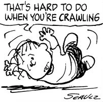 After almost fifteen years in which Rerun was only shown sitting on the back of his mother's bicycle, or on the floor, a comic strip from May 9, 1987 showed that Rerun had reverted to crawling. After Lucy tried to teach Rerun to snap his fingers while walking, Rerun proved unable to snap his fingers because he could only crawl.