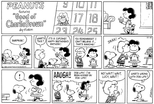 Schroeder kisses Lucy on Beethoven's birthday in a comic strip from December 16, 1984.