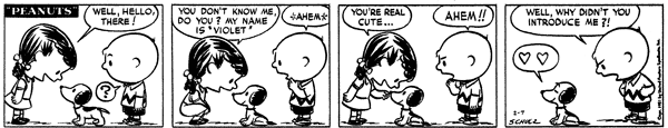 In the strip from March 17, 1963, Violet offers Charlie Brown a valentine in person, explaining that she felt bad about not having done so in the past, only to be upbraided by Schroeder, who happened to be nearby, for giving the valentine merely to ease her own conscience. In the end, however, Charlie Brown still accepts the valentine, much to Schroeder's surprise.