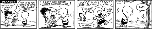 Violet and Patty tell Charlie Brown he is not invited to a party in the strip from October 15, 1952.