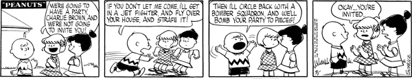 - In the strip from September 1, from 1954, Charlie Brown uncharacteristically threatens to strafe, then bomb their house if he is not invited, to which both girls state "Okay, you're invited."[6]