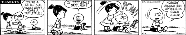 A classic example of this is in the strip from May 3, 1961, in which Violet is seen lashing out at Charlie Brown, finishing him off with the line, "And I don't care if I ever see you again, do you hear me?!" Linus walks in and notices that Charlie Brown is really hurt. Charlie Brown then points out that Violet has not taken all the life out of him, lamenting "but you can number me among the walking wounded."