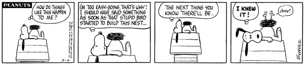 Snoopy started befriending birds in the early 1960s. His bird friends appeared occasionally, and, unlike Woodstock, looked like actual birds. Woodstock made his debut, in March 1966, when one of Snoopy's bird friends made her nest on Snoopy's stomach. After the mother bird left and did not come back, Snoopy decided to care for the birds until they hatched (which proved to be very difficult). When the eggs hatched two baby birds were born. Snoopy soon made them fly away, but one bird, who would later be named as Woodstock, who had a lot of trouble flying, came back. The undertalented bird stayed by Snoopy and his doghouse. At first, Snoopy was annoyed by the winged pest, but eventually warmed to him.