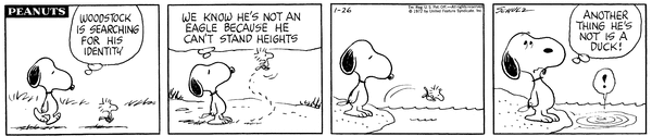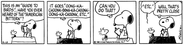 Snoopy has often wondered what type of bird Woodstock is. In a series of strips from September and October 1980, Snoopy attempts to identify him using his Guide to Birds. The birds which Snoopy suggests and Woodstock attempts to imitate are: crow, American bittern, Caroline wren, rufous-sided towhee, yellow-billed cuckoo, Canada goose, warbler, and a mourning warbler. Snoopy finally gives up trying to figure it out in the strip from October 11, 1980, and hurts Woodstock's feelings by saying, "For all I know, you're a duck". Snoopy takes it back with a quick hug, at which point it becomes clear that it does not matter what type of bird Woodstock is; the only important fact is that he is Snoopy's best friend.