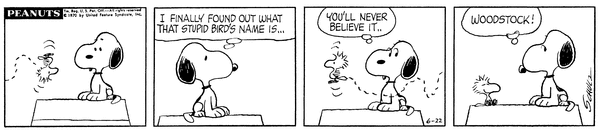 The bird was named Woodstock on June 22, 1970. Since then, Snoopy and Woodstock have been close friends. Snoopy even became friends with Woodstock's friends, who do not look like normal birds either. Woodstock and his bird friends together form Snoopy's Beagle Scouts.